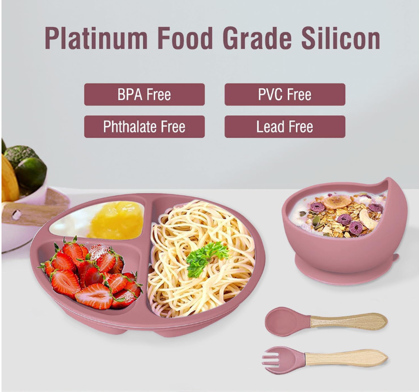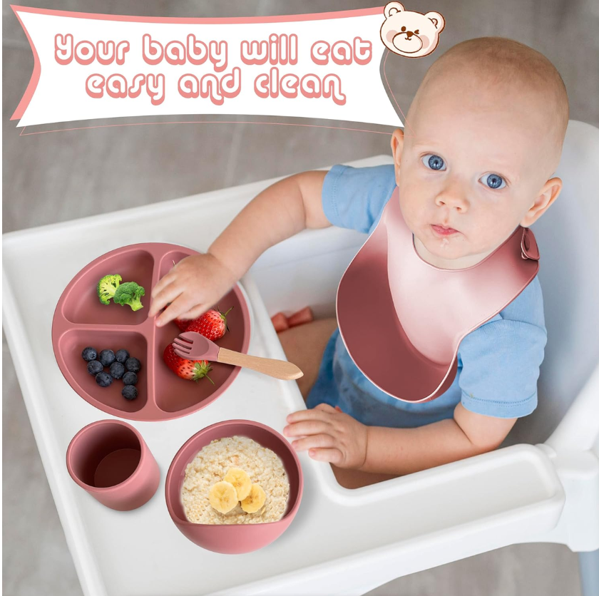 High Quality & Easy to Clean: The high-quality silicone makes them soft and gentle for full safety, yet unbreakable so you don't need a replacement. This baby eating supplies set are easy to clean, dry quickly and are non-porous to avoid bacteria-build up. All pieces are dishwasher safe, easy to wipe down and suitable for microwave and refrigerator. You can spend more time with your little one and spend less time cleaning.